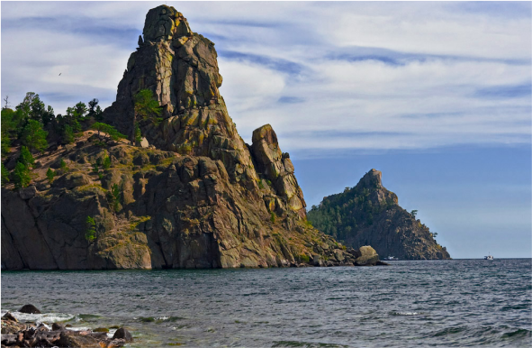 Переход в пролив Малое Море к мысу Хобой острова Ольхон – 4 ч., фото с теплохода северной оконечности острова Ольхон. Переход вдоль острова Ольхон мимо скального ансамбля Саган-Хушун (Три брата) к мысу Бурхан – 2,5 ч. Пешая прогулка к Шаман-Скале (одно из самых живописных мест на Байкале), фото, отдых на песчаном
